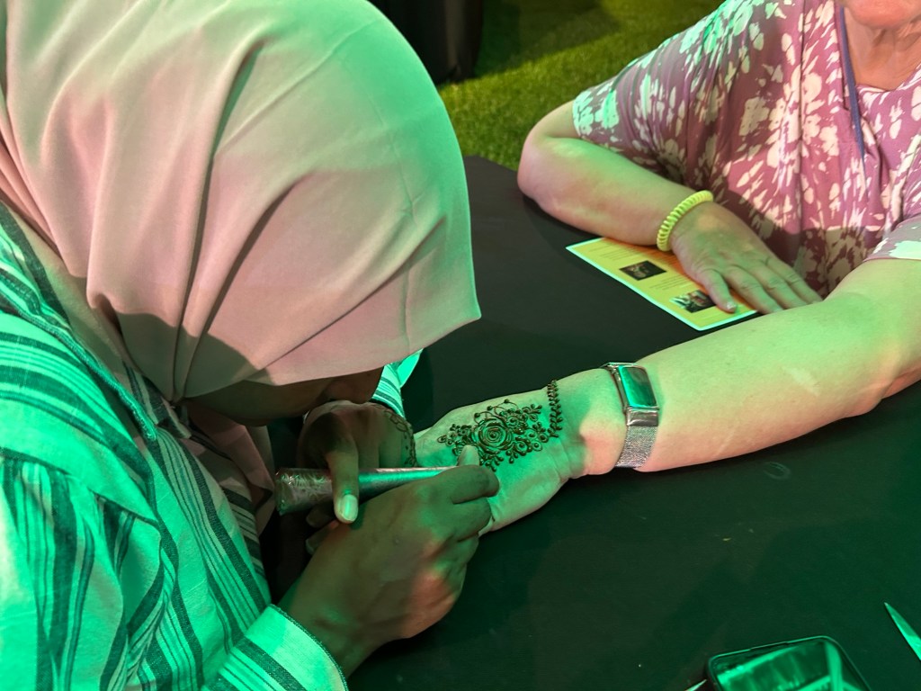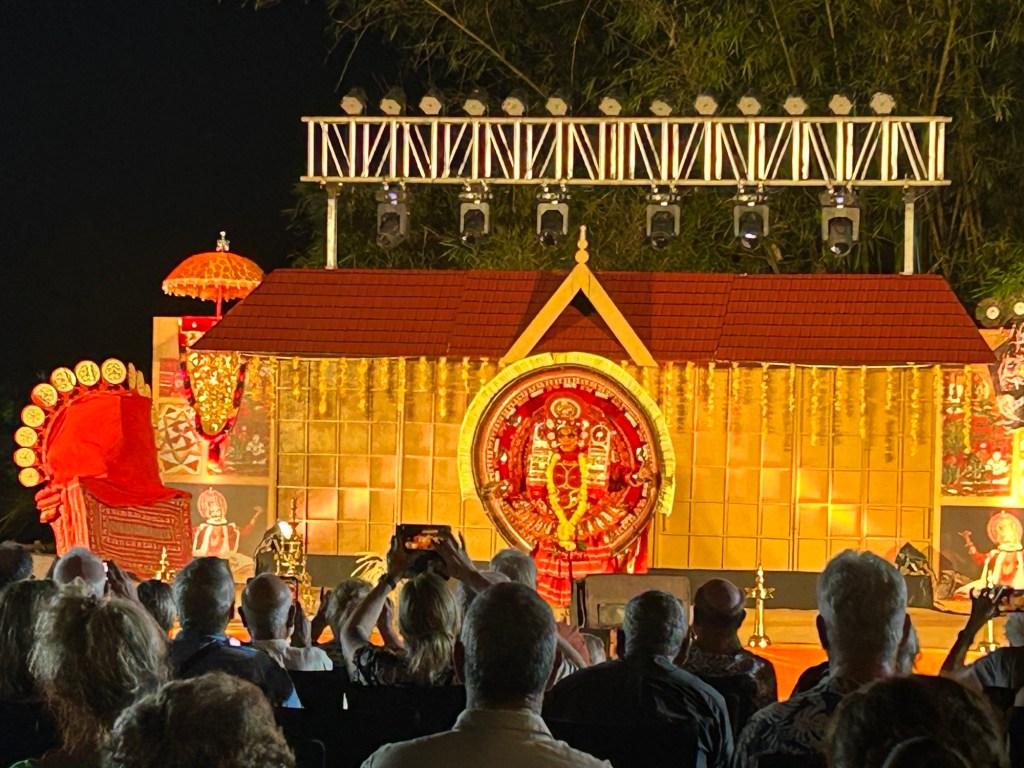 Greeting us as we arrived on the grounds of LeMeridien Cochin (where I contemplated spending US $86 for a room to watch the final round of The Masters!). The theme for the eveningMohiniyattam-A temple art, which literally means the dance of the enchantress. Kathakali-with the emphasis on facial expressions and hand gestures in this highly stylized performance, the whole face of the artist is painted and he enacts the various emotions narrated in song by accompanying singers. They yam-Rooted in ancient beliefs and customs, Theyyam depicts folk stories through elaborate rituals and costumes. Theyyam performances are often held in temples and religious squares during religious festivals. A Velakali artist paints a henna design on my hand. Joe was asking for the next week when it would wash off….