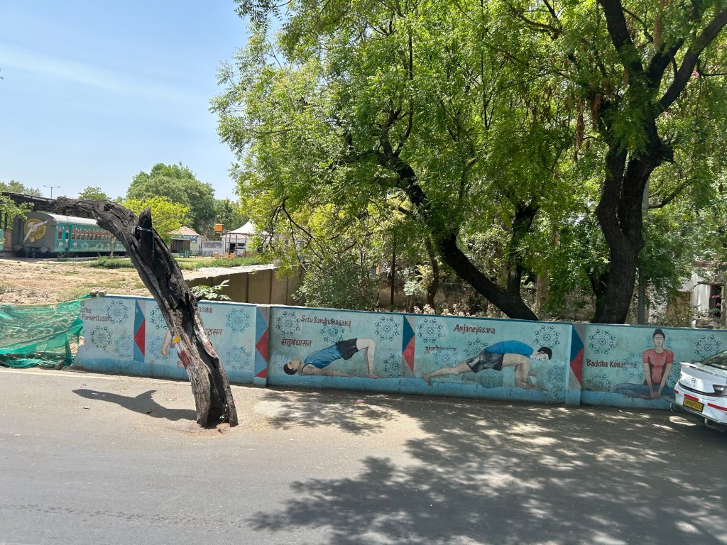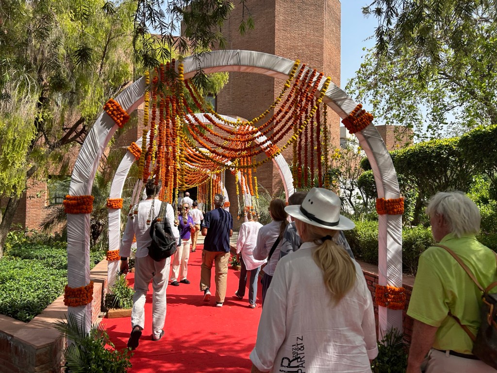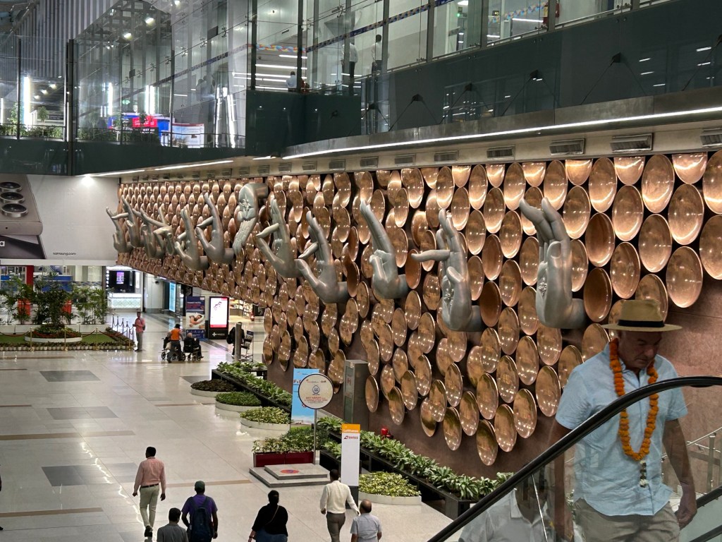 A beautiful sculpture of a message in sign language in the Delhi airport. The group all received marigold leis similar to what the gentleman on the escalator is wearing.