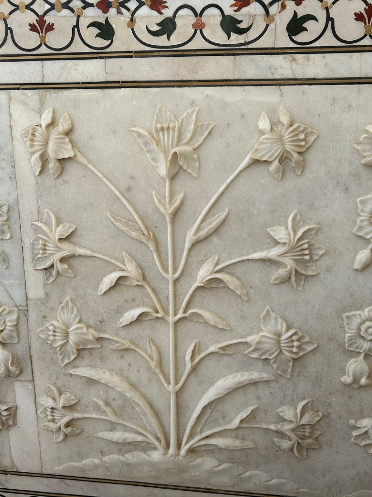 The Taj Mahal’s marble inlay work showcases an array of motifs, including intricate floral patterns, vines, arabesques, and calligraphy. These designs are meticulously arranged to create symmetrical compositions, enhancing the architectural harmony of the monument.