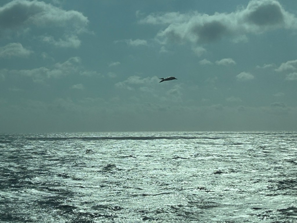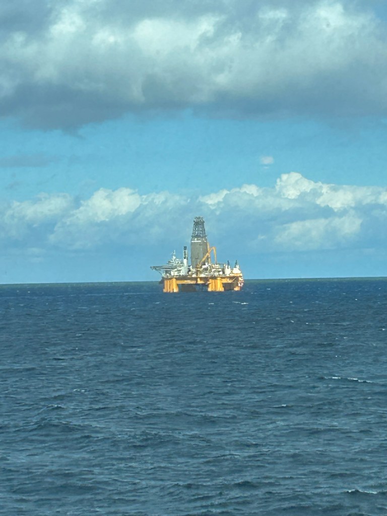 The route took the ship past several North Sea oil rigs. And there was a gull along for the ride