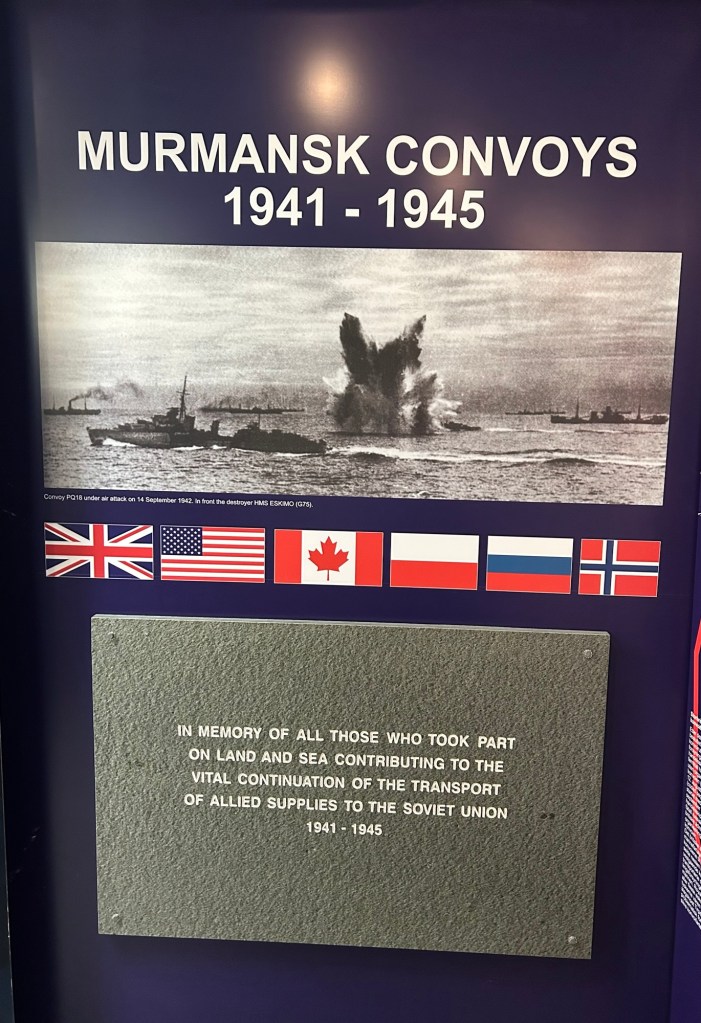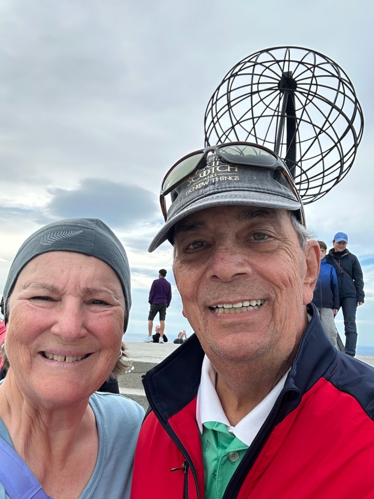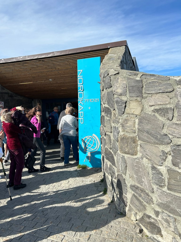 Perused the gift shop. Joe found some Viking socks he had to have. Marianne bought stamps and a few postcards, along with a souvenir pen to write the cards and mail them. A movie in the downstairs theater followed. Weird movie. A stop on one of the floors where there is a tribute to the lives lost defending the North and Berents Sea during WW 2. Then the walk to the point.