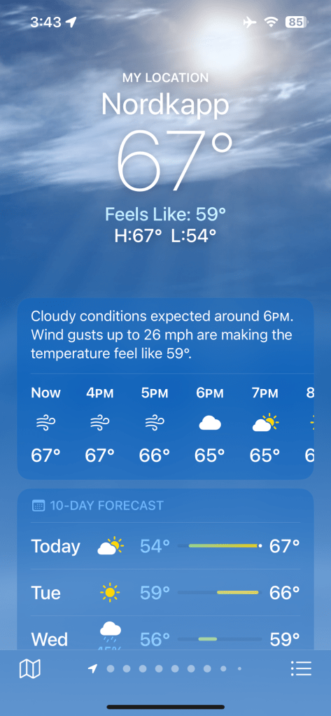 The northernmost town on the European mainland and the primary gateway to the North Cape, the chosen excursion of the day and night. The ship arrived at 2:00 PM and the planned departure was 8:00 PM.