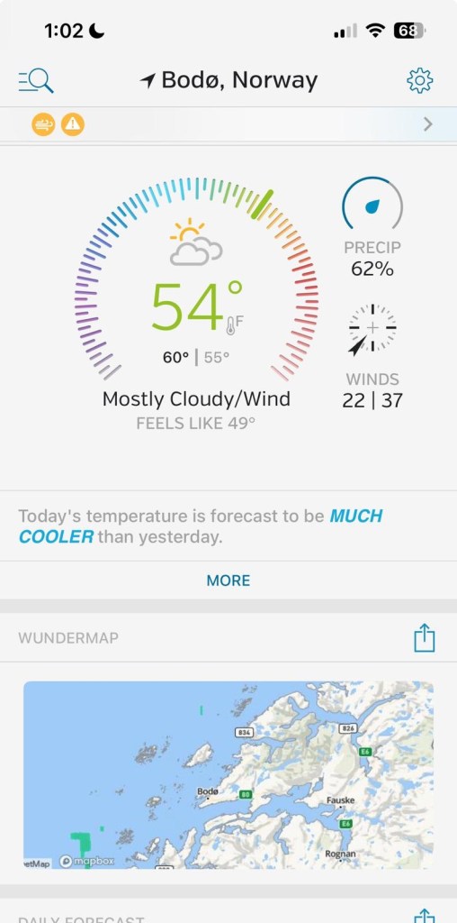 The city lies just north of the Arctic Circle where the midnight sun is visible from June 2 to July 10. Due to atmospheric refraction there is no true polar night in Bodø, but because of the mountains south of Bodø, the sun is not visible from the city from early December to early January. As the European Capital of Culture in 2024, it showcases rich Sami heritage, modern art, and a lively music scene.