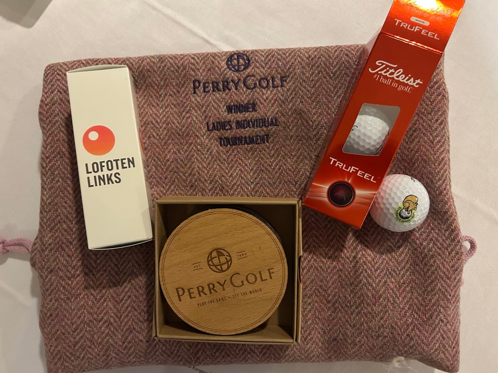 Back to the stateroom to dress for the evening. A cocktail party with Bob and Karrie to say goodbye to Mark and Melinda. And then the Perry Golf Farewell. The prizes for the previous day’s competition were awarded. And I won low net of the ladies!