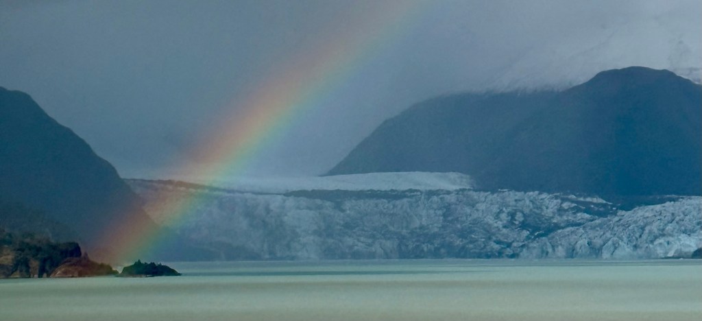 Traveling through the Chilean Fjords for two days. A glacier and a beautiful rainbow. Joe and I both finished a book while admiring some unspoiled scenery.